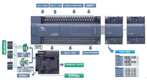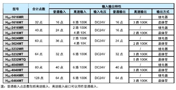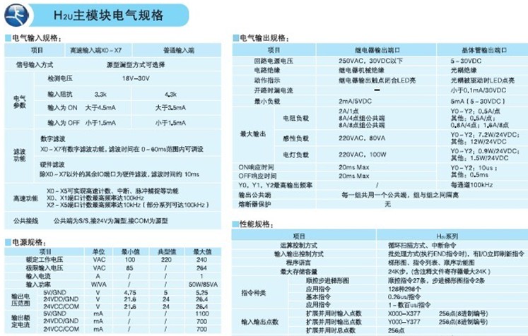 H2U可編程控制器的主要特點:程序存儲空間大,無需外部擴展內存卡即可達24K步;模塊內部集成了大容量電源,可直接給傳感器、HMI、外部中間繼電器等提供電源;提供多通道高頻率高速輸入輸出端口,豐富的運動和定位控制功能;集成兩個獨立通訊口,提供了豐富的通信協議,提供MODBUS指令,方便系統集成;提供完備的加密功能,保護用戶知識產權;