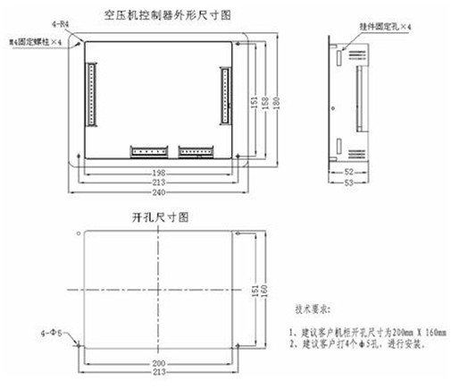 控制器尺寸與安裝方法 控制器為一體結構,采用空壓機柜門嵌入安裝方式,控制器安裝尺寸如下:
